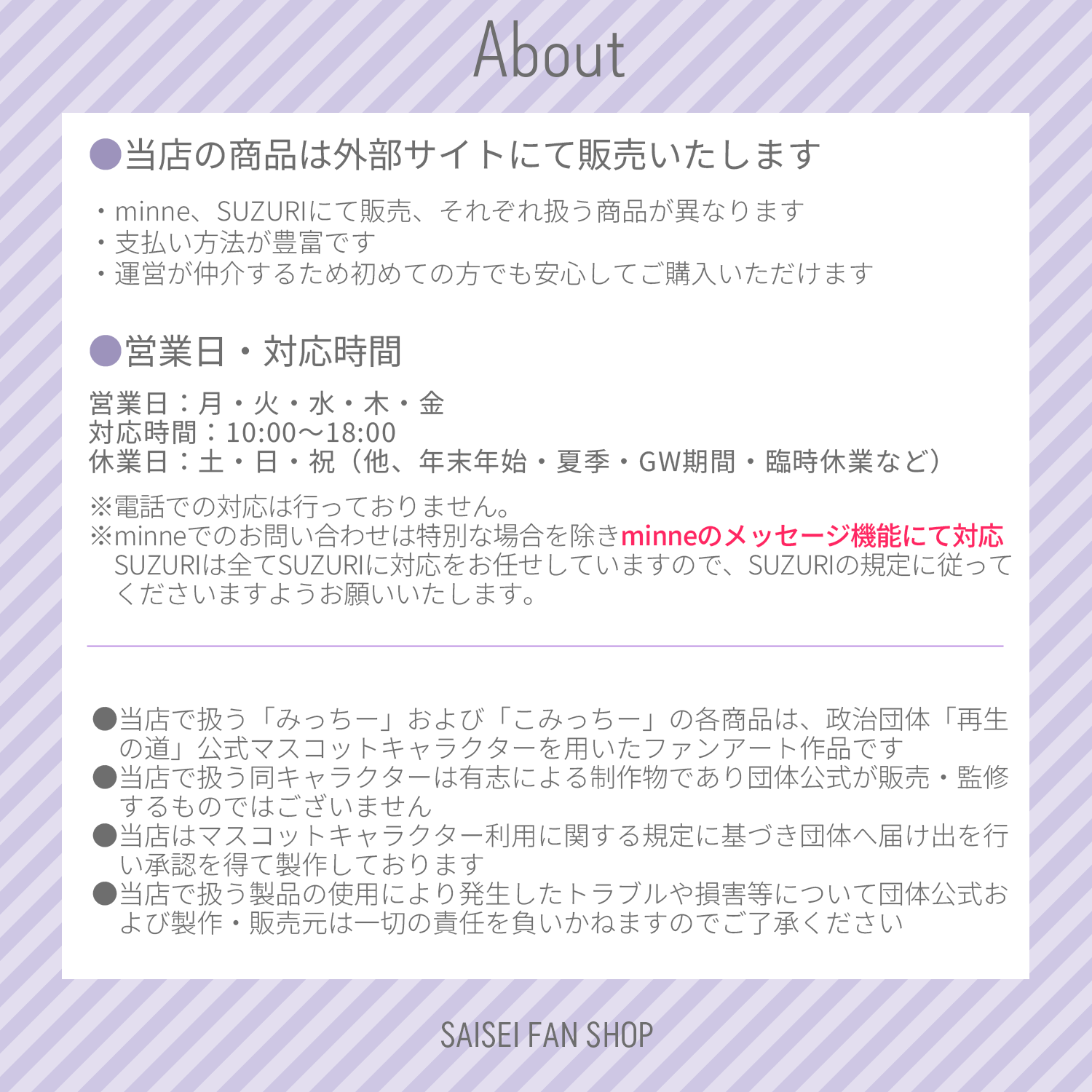 ●当店で扱う「みっちー」および「こみっちー」の各商品は、政治団体「再生の道」公式マスコットキャラクターを用いたファンアート作品です